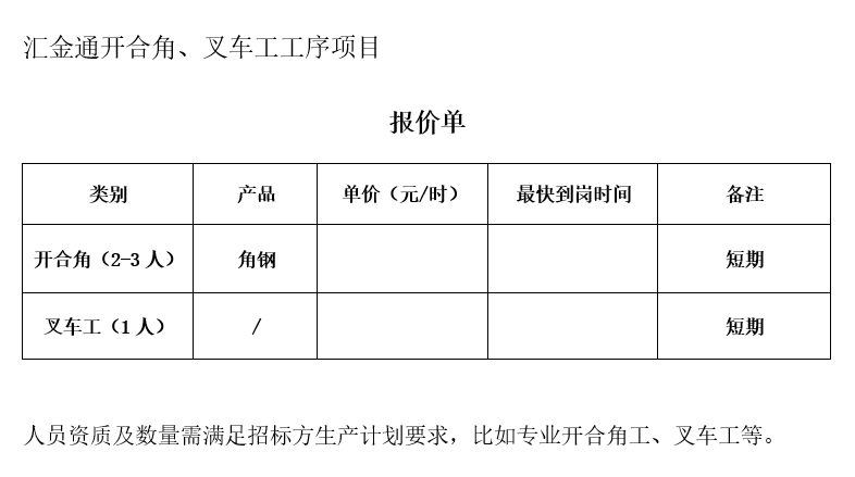 8、人員資質及數量需滿足招標方生產計劃要求,比如專業開合角工、叉車工等;